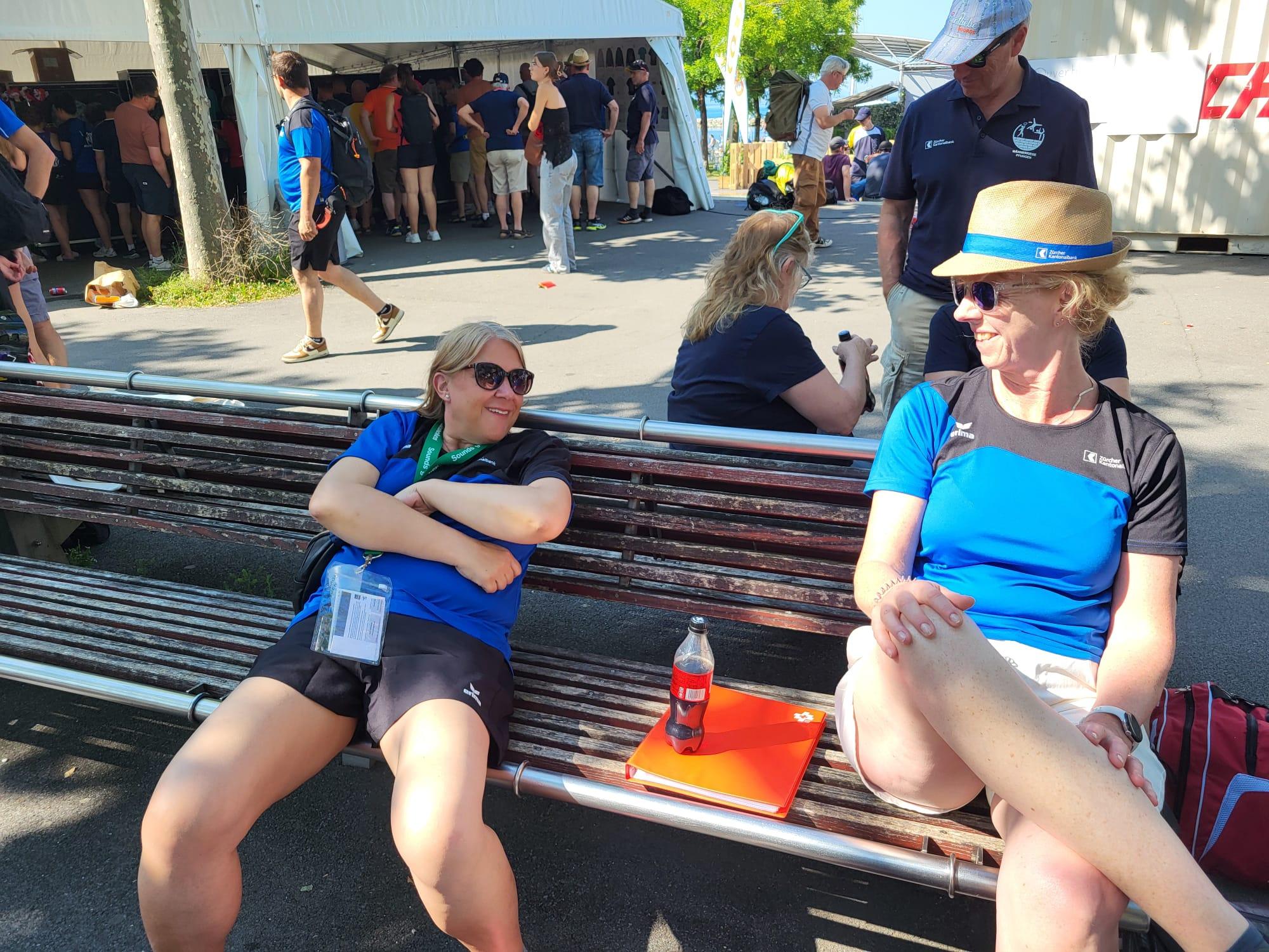 Die Wärme rief nach einem kühlen Bad im Genfersee… oh, wie gut das tat! Einige Frauen genossen die Abkühlung, andere den Schatten grosser Bäume. Etwas erfrischt machten wir uns später auf den Weg in die Unterkunft, wo wir unser Gepäck deponieren konnten. Zurück auf dem Festplatz liessen wir uns vom kulinarischen Angebot verwöhnen und genossen ein feines Glas Weisswein. Den Abend liessen wir gemeinsam mit der guten Stimmung des Turnfestes am Festgelände am Seeufer ausklingen.