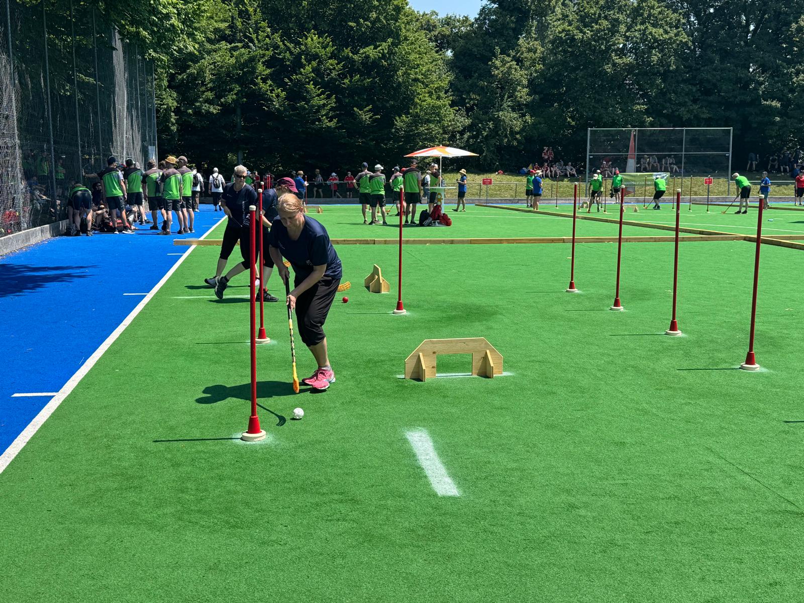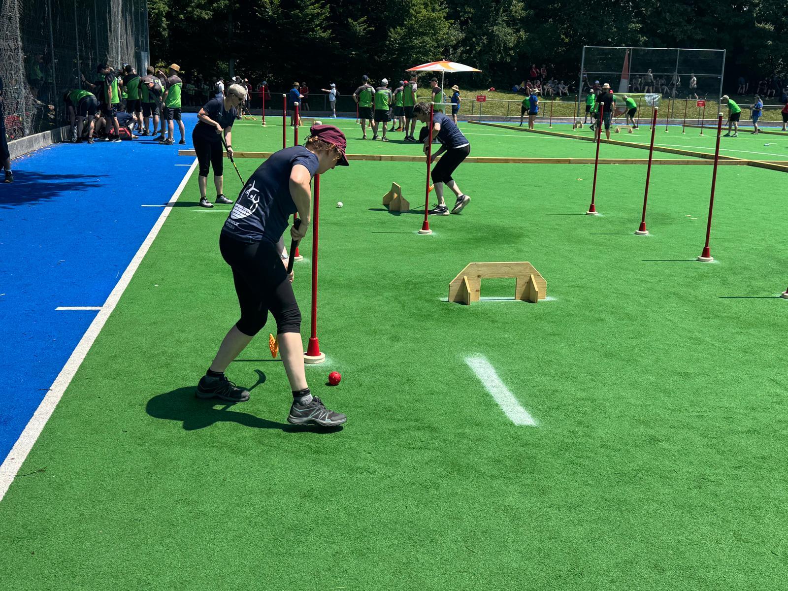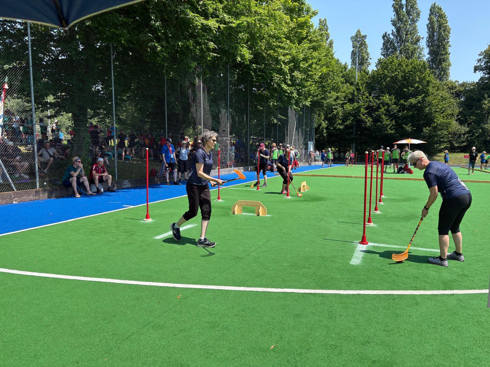 Schon bald ging es an den ersten Wettkampfteil: der Fussball-Parcours und Brettball. Mit einer Endnote von 8.94 Punkten waren wir zufrieden mit unserer Leistung. Weiter ging es mit Unihockey im Team und dem 8er-Ball. Auch da lief es gut, nur wenige Fehler passierten, und wir erhielten die Endnote 8.73. Zum Abschluss – es war schon sehr heiss – absolvierten wir noch Street Racket sowie die Aufgaben mit dem Moosgummi & dem Gymnastikstab. Dafür erhielten wir eine 8.22.