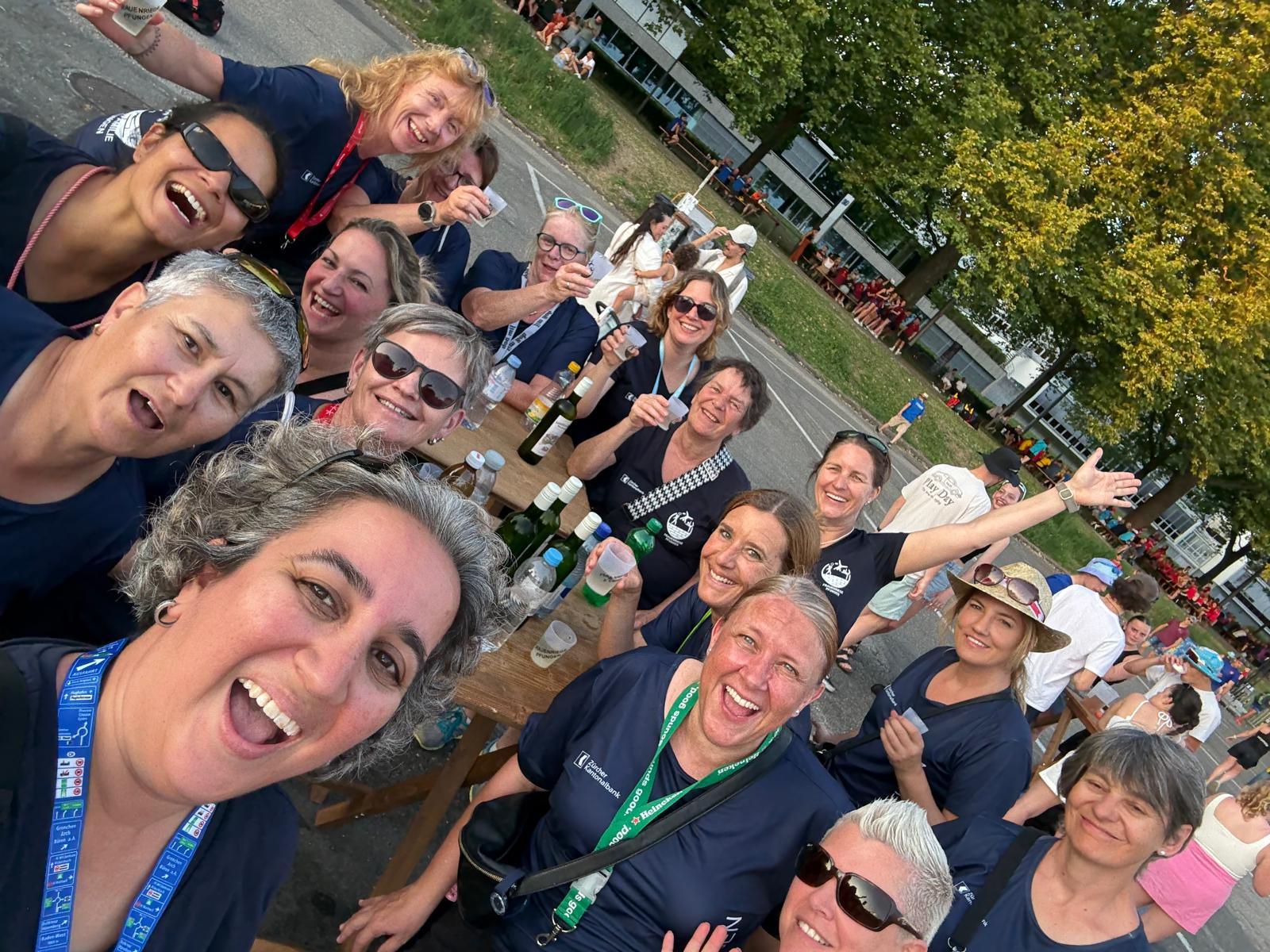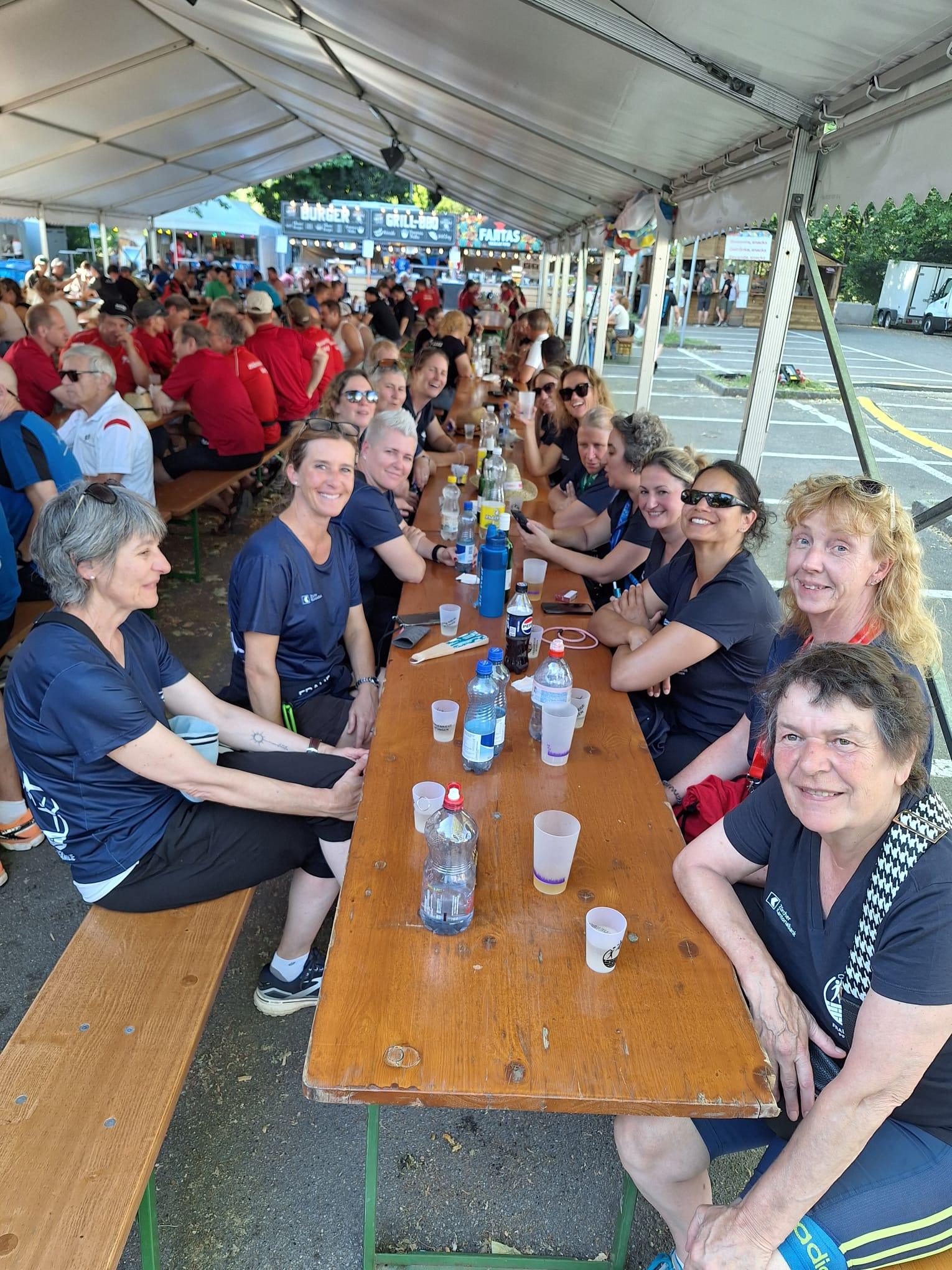 Glücklich mit unseren Resultaten suchten wir uns einen Schattenplatz und stiessen mit unseren eigenen FR-Pfungen-Bechern auf unsere Leistungen an. Mit einer Endpunktzahl von 25.89 Punkten und einem 145. Rang in der 3. Stärkeklasse waren wir sehr zufrieden (von knapp 300 Vereinen). An dieser Stelle ein herzliches Dankeschön an unsere Kampfrichterinnen Claudia und Sandra.